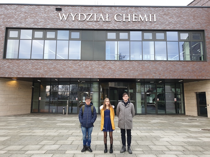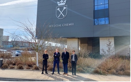 od lewej: Szymon Malczenko - 3F, Gabriel Bednarz - 4E, Mateusz Detko - 4E oraz Jakub Pacaj - 2G  w siedzibie Wydziału Chemii UJ w Krakowie. Zaszczytny tytuł Laureata Olimpiady uzyskał Szymon Malczenko z klasy 3F. Bardzo serdecznie gratulujemy!