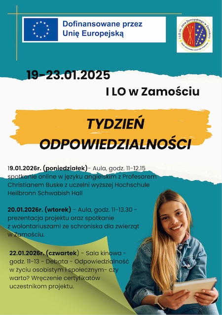 W dniach 19–23 stycznia 2026 r. w I Liceum Ogólnokształcącym im. Jana Zamoyskiego w Zamościu odbędzie się Tydzień Odpowiedzialności – wydarzenie poświęcone refleksji nad odpowiedzialnością w życiu osobistym i społecznym młodych ludzi. Inicjatywa realizowana jest w ramach projektu dofinansowanego ze środków Unii Europejskiej.
