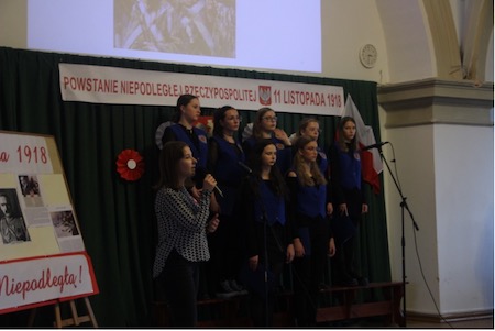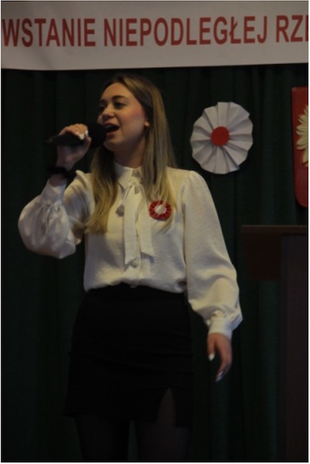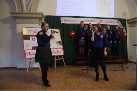 Mamy dziś szczęście dorastać i żyć w wolnym kraju, a Ojczyzna- jak stwierdził Cyprian Kamil Norwid- to wielki zbiorowy obowiązek. Po tych słowach Katarzyna Wiśniewska z klasy 3d wykonała utwór: „Miejcie nadzieję”, następnie już wspólnie z chórem wszyscy odśpiewali pieśni patriotyczne: „Ułani”, „Maszerują strzelcy”, „Legiony”. Oddając hołd wszystkim, którzy walczyli za Ojczyznę odśpiewaliśmy „Rotę”. Na zakończenie części artystycznej Julia Michalewska odśpiewała „Mury” przy akompaniamencie Łukasza Marchwianego z klasy 3g.