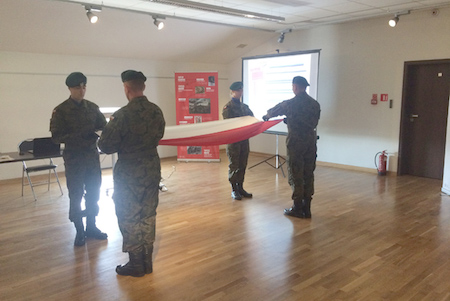 Prowadzący wykład płk. Marek Kwiecień - Wiceprezes Zarządu Głównego Polskiego Towarzystwa Weksylologicznego, przedstawił historię kształtowania się barw narodowych i flagi narodowej, a także omówił zasady jej eksponowania. W spotkaniu udział wzięli: Barbara Czausz, Krystian Petz, Aleksandra Staniecka, Olga Krupa, Karolina Stępniak.