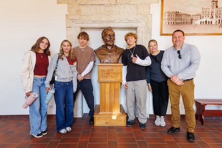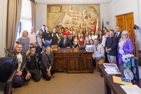 W programie dnia znalazło się również spotkanie z Prezydentem Miasta Zamość, panem Rafałem Zwolakiem oraz jego zastępcą, panem Markiem Kudelą. Pan Prezydent zademonstrował uczniom miecz rodem z filmu fantasy i opowiedział fascynującą historię o Zamościu i… legendarnym “szwedzkim stole”!