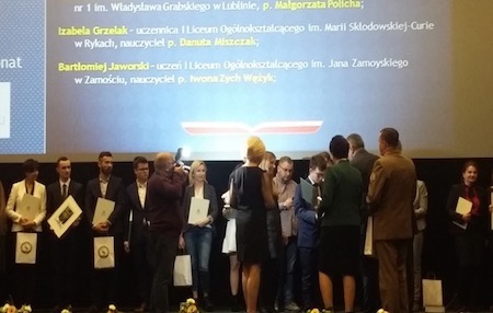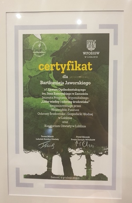 Podczas uroczystej gali Bartłomiej Jaworski otrzymał z rąk Lubelskiego Kuratora Oświaty p. Teresy Misiuk, Dyrektora zamojskiej Delegatury Kuratora Oświaty w Lublinie p. Moniki Żur oraz Wiceprezesa Zarządu Wojewódzkiego Funduszu Ochrony Środowiska i Gospodarki Wodnej w Lublinie p. Grzegorza Grzywaczewskiego specjalny certyfikat i dyplom potwierdzający otrzymanie stypendium.