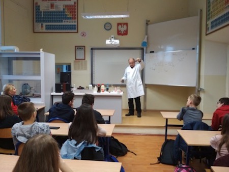 W ramach współpracy między I Liceum i Zespołem Szkół Społecznych w Zamościu 17 listopada w naszej szkole odbyły się zajęcia z chemii dla uczniów klas drugich Gimnazjum Społecznego. Spotkanie poprowadził nauczyciel I LO, profesor oświaty - pan Włodzimierz Kuśmierczuk, który od kilku lat organizuje Kuźnię chemiczną, czyli zajęcia dla młodzieży szczególnie uzdolnionej w tej dziedzinie.