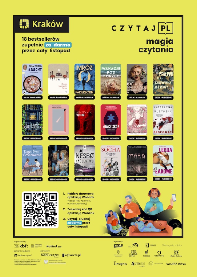 Nasza biblioteka dołączyła do ogólnopolskiej akcji Czytaj.pl dzięki czemu przez cały listopad możecie mieć bezpłatny dostęp do 18 książek wydanych w ostatnim czasie, które zdobyły już uznanie czytelników. Książki dostępne są w formacie ebooka i audiobooka. Wystarczy zainstalować w telefonie darmową aplikację Woblink, zeskanować kod QR z plakatu, wybrać sobie książkę i możecie zanurzyć się w świecie literatury.