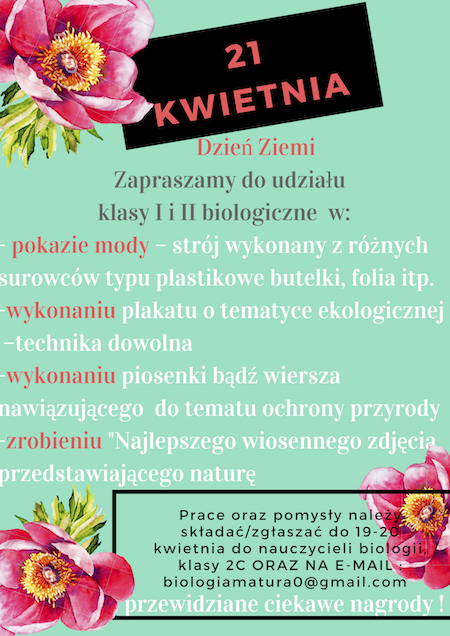 Zapraszamy do udziału wszystkie klasy I i II, nie tylko o profilu biologicznym do udziału w DNIU ZIEMI.