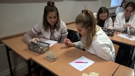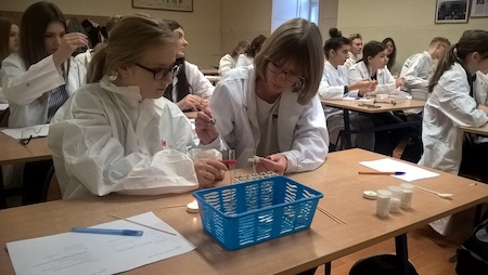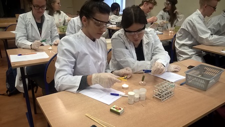 Uczniowie samodzielnie wykonywali szereg inspirujących doświadczeń m.in.: porównywali moc kwasów, przeprowadzili elektrolizę wody i otrzymywali acetylen. Mamy nadzieję, że przyjazna atmosfera podczas zajęć rozbudziła zainteresowania chemiczne uczniów.