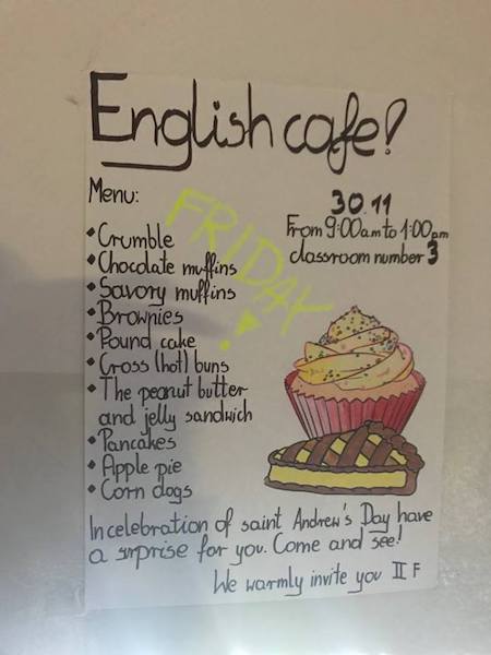 W ramach ,,Innowacyjnej lekcji angielskiego” uczniowie klasy 2F przy pomocy klasy 1H przygotowali English Café. W menu znalazły się tradycyjne angielskie dania takie jak: corn dogs, apple pies, muffins, pancakes, hot cross buns, crumble itd. oraz St. Andrew's Cakes, czyli ciasteczka z wróżbą, bo co to za Andrzejki bez wróżb? Oczywiście wróżby także napisane były po angielsku. To jednak nie tylko kawiarenka. Uczniowie przygotowali rozbudowaną prezentację (102 slajdy), w której znalazły się opisy dań oraz przepisy na nie.