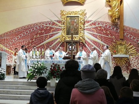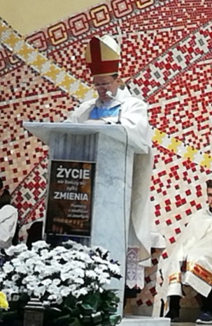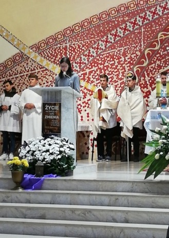 Po przerwie uczestnicy udali się do kościoła Matki Bożej Królowej Polski, gdzie wzięli udział we Mszy św. koncelebrowanej, której przewodniczył ks. biskup Marian Rojek. W Liturgii Słowa aktywny udział wzięły uczennice naszej Szkoły: Wiktoria Węglińska i Zofia Iwaniec. W homilii Pasterz Diecezji podkreślił, że potrzebujemy autorytetów, nawet jeśli nie przystają do współcześnie propagowanego stylu życia. Zachęcał do rozglądania się za wzorami, wartościami, stabilnymi punktami odniesienia. Mówił, że warto mieć oczy skierowane ku niebu, ponieważ tam jest cel drogi każdego człowieka. Przypomniał, że szczególnymi przewodnikami w wędrówce są bł. Karolina i św. Stanisław. „I ty bądź taki, taka jak oni. Bez Boga jesteśmy przegrani w swoim życiu. Z młodzieńczym zapałem szukajcie możliwości rozwijania swej świętości.” Zachęcił też do wytrwałej pracy w pokonywaniu własnych wad i słabości.