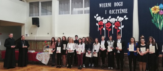 Po Mszy św. uczestnicy konkursu wraz z opiekunami udali się do Szkoły Podstawowej Nr 4, gdzie w auli z rąk Księdza Biskupa otrzymali dyplomy i nagrody.