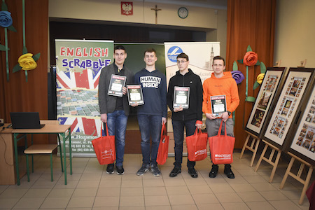 W dniu 22 marca odbył się finał konkursu English Scrabble organizowanego przez II LO w Zamościu. Wśród 16 finalistów znalazło się 4 uczniów naszego liceum Karol Dominik (Ie), Piotr Płatek (2i), Katarzyna Szczerba (2i) i Patryk Zawada (2i). Pierwszych 2 chłopaków zakwalifikowało się do ścisłego finału. Gratulujemy!