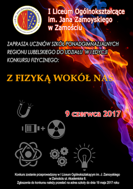 I Liceum Ogólnokształcące im. Jana Zamoyskiego w Zamościu zaprasza uczniów szkół ponadgimnazjalnych regionu lubelskiego do udziału w I edycji konkursu fizycznego: „Z fizyką wokół nas”. Regulamin konkursu