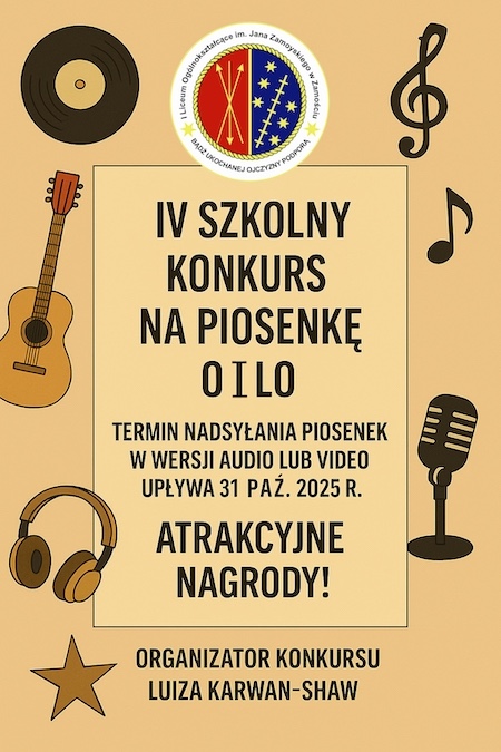 Zapraszamy Was serdecznie do udziału w IV edycji konkursu na tekst piosenki o I LO – naszej szkole, jej życiu codziennym i wyjątkowej atmosferze. Konkurs skierowany jest nie tylko do obecnych uczniów, ale również do absolwentów i wszystkich osób związanych z naszym liceum (a nie wyłącznie do ósmoklasistów!).