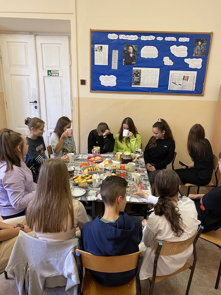 W grupach klas 1d, 1g i 3b odbyły są klasowe kawiarenki z angielską herbatką z prasówką. Młodzież przyniosła na lekcje samodzielnie upieczone ciasta z angielskich przepisów Victoria spongecake, lemon drizzle i shortbread a ich anglista przyniósł tradycyjnie podawaną z mlekiem angielską herbatę Yorkshire Tea.