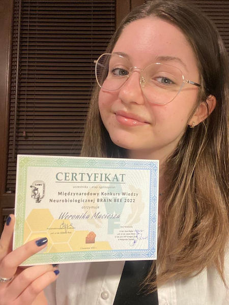 2 kwietnia 2022 r. Weronika Maciesza uczennica klasy 3e uczestniczyła w finale ETAPU CENTRALNEGO Ogólnopolskiego Konkursu Neurobiologicznego Brain Bee. Do awansu do elitarnego grona 5 laureatów uczestniczących w zmaganiach międzynarodowych zabrakło trochę szczęścia. Konkurs Wiedzy Neurobiologicznej Brain Bee odbywa się pod patronatem Polskiego Towarzystwa Przyrodników im. Kopernika.