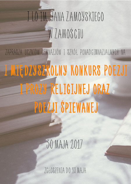 Już 30 maja w auli I Liceum odbędzie się I Międzyszkolny Konkurs Recytatorski Poezji i Prozy Religijnej oraz Religijnej Poezji Śpiewanej. Konkurs jest adresowany do uczniów szkół gimnazjalnych i ponadgimnazjalnych. Zgłoszenia są przyjmowane do 10 maja. Organizatorem przedsięwzięcia, którego celem jest zainteresowanie uczniów poezją, a także poszukiwanie literackich wzorców i wartości istotnych w duchowym życiu człowieka są katecheci naszej szkoły. Zasady uczestnictwa i inne przydatne informacje dostępne pod adresem: http://www.1lo.com.pl/konkursy-85/Konkurs-Poezji-Religijnej-245