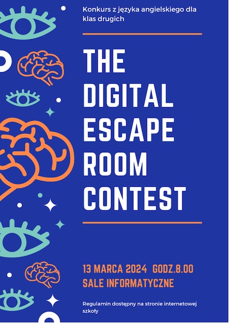 Zapraszamy 3-osobowe drużyny z klas drugich do wzięcia udziału w kolejnej edycji konkursu z języka angielskiego The Digital Escape Room. Szczegóły dotyczące konkursu znajdują się na plakacie oraz u organizatorów (Pani Monika Borowska i Paulina Bryła). Do zobaczenia!