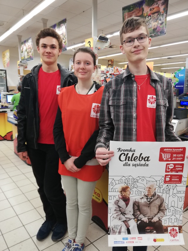 Koło Caritas działające przy naszej Szkole włączyło się czynnie w akcję Caritas Polska Diecezji Zamojsko-Lubaczowskiej zorganizowaną pod hasłem „Kromka chleba dla sąsiada”. 20 – 21 września 2019 r. (piątek i sobota) nasi wolontariusze przeprowadzili bardzo owocną zbiórkę żywności w dwóch sklepach sieci Biedronka na terenie Zamościa (ul. Sadowa, ul. Peowiaków). Celem działania było uwrażliwienie społeczeństwa szczególnie na położenie osób starszych i wsparcie ich w przeżywaniu codzienności. Zebrane produkty będą przekazane przez Parafialne Zespoły Caritas najbardziej potrzebującym seniorom oraz ludziom samotnym.