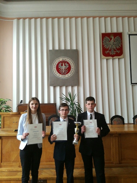 W sobotnie popołudnie dotarła do Zamościa miła wiadomość. Startujący w finale Ogólnopolskiej Olimpiady Wiedzy o III RP w Białymstoku uczniowie I LO zdobyli dwa tytuły laureatów - Krzysztof Łoza, Ilona Rębisz, a Marcin Witkowski został finalistą. Gratulujemy uczniom i opiekunowi p. Zygmuntowi Kamińskiemu i czekamy na kolejne wiadomości z olimpijskich zmagań już za tydzień.