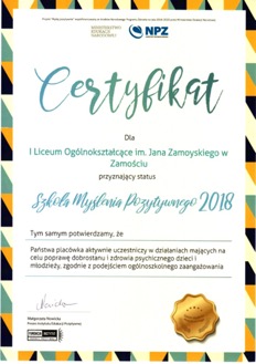 W październiku nasza szkoła zgłosiła swój udział do programu certyfikacji szkół: „Szkoła pozytywnego myślenia” i była jedną z 450 kandydatek do tego tytułu na 100 miejsc w Polsce. Program i certyfikacja prowadzona jest przez Instytut Edukacji Pozytywnej w Warszawie.