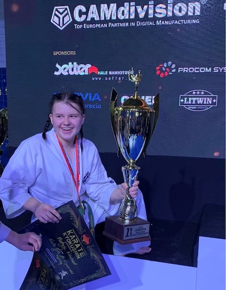 W Mistrzostwach świetnie spisała się nasza uczennica Martyna Nowosad, która reprezentowała nasz kraj w kategorii kumite juniorek młodszych +60kg. Zdobywając złoty medal Martyna obroniła tytuł Mistrzyni Europy wywalczony rok temu w Warnie w Bułgarii.