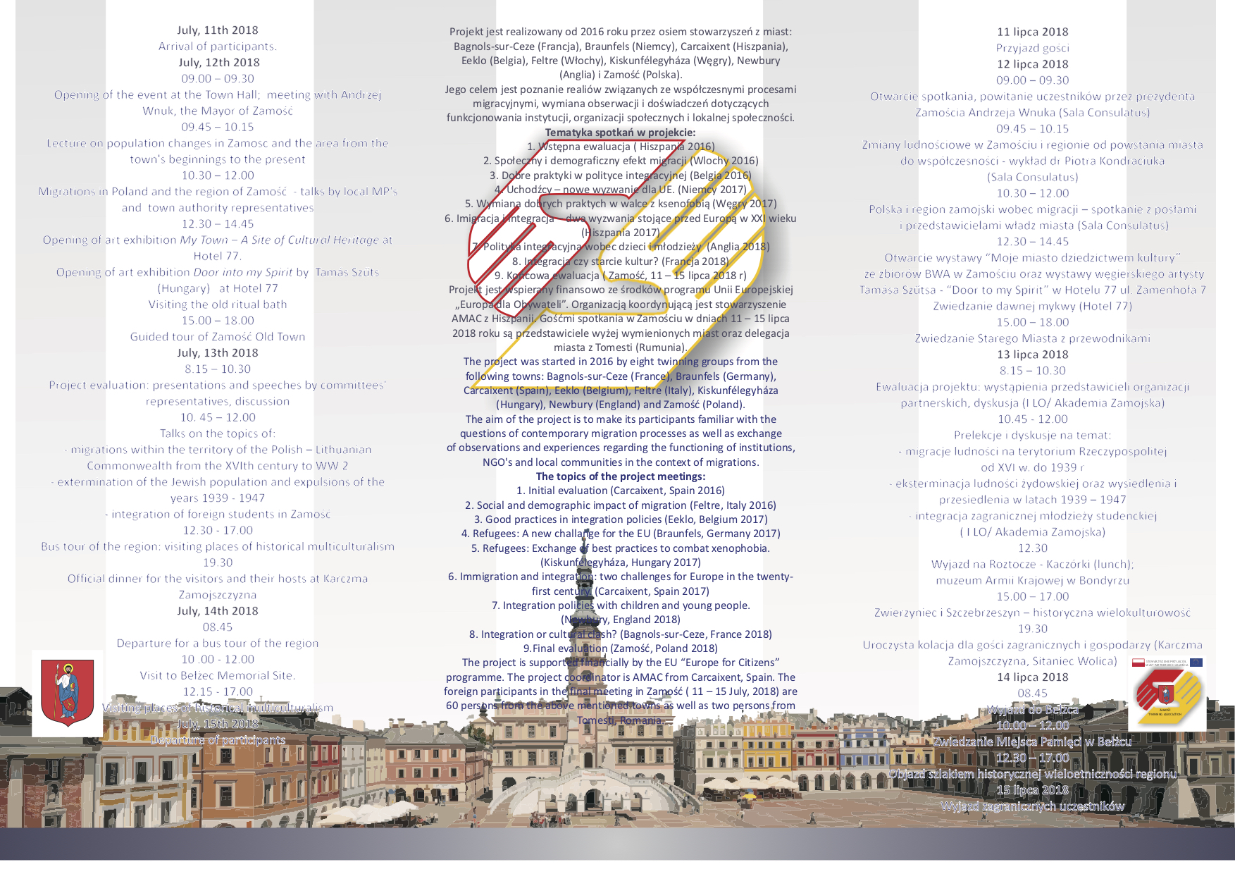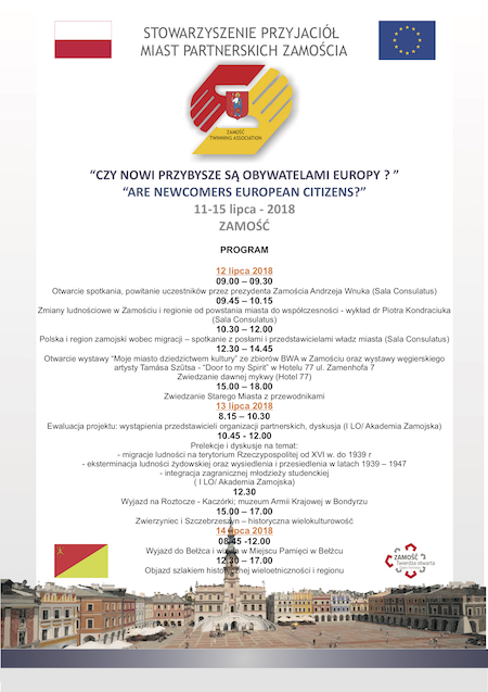 Zapraszamy uczniów I LO oraz inne zainteresowane osoby do udziału w międzynarodowym spotkaniu zorganizowanym przez Stowarzyszenie Przyjaciół Miast Partnerskich Zamościa. Tematyka spotkania oraz szczegółowy program znajdują się w załączonym folderze. Szczególnie zapraszamy na spotkanie, które odbędzie się w naszej szkole w piątek 13 lipca w godzinach 8:15 –12:30.