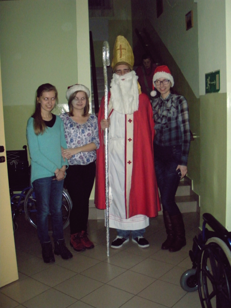 Nasz szkolny Mikołaj i jego drużyna są w tym roku naprawdę zapracowani! ;) 14 grudnia odwiedzili Dom Pomocy Społecznej prowadzony przez Zgromadzenie Sióstr Franciszkanek Misjonarek Maryi. Dom Pomocy Społecznej w Zamościu jest przeznaczony dla 52 wychowanek niesprawnych intelektualnie w stopniu znacznym i głębokim, których stan zdrowia nie wymaga leczenia szpitalnego, ale wszystkie przebywające tam osoby potrzebują stałej opieki. Sekcja charytatywna przygotowała paczkę, w której znajdowały się najpotrzebniejsze dla ośrodka produkty oraz słodycze dla ich mieszkanek.