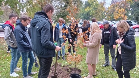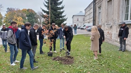 12 października przed budynkiem naszej szkoły klasa 3bg z panią dyrektor Bożeną Krupą oraz wychowawczynią panią Agnieszką Niańko posadziła dęby szypułkowe. To działanie symbolicznie wpisało się w tegoroczne obchody Święta Drzewa i wspólną akcję sadzenia drzew, której inicjatorem jest Uniwersytet Marii Curie-Skłodowskiej w porozumieniu z Regionalną Dyrekcją Lasów Państwowych w Lublinie oraz szkołami partnerskimi z całego województwa lubelskiego. Każde drzewo posadzone w mieście, szczególnie poza lasami, to dodatkowa produkcja tlenu i pobór dwutlenku węgla. Akcja sadzenia drzew ma na celu popularyzację postaw ekologicznych wśród młodzieży.