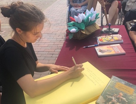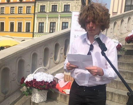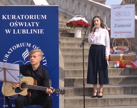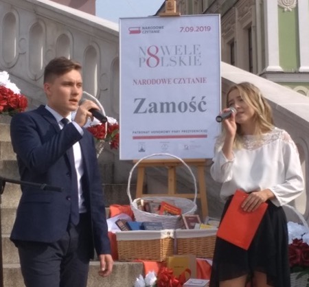 We wspólne czytanie polskich nowel pod schodami zamojskiego ratusza włączyli się uczniowie i poloniści naszego liceum. Uczniowie przygotowali oprawę muzyczną uroczystości. Paulina Czugała, Weronika Bielińska, Mikołaj Chmura z klasy 3e, Agata Ostasz z 2h i Jakub Kot z 3c wykonali pełne zadumy piosenki poetyckie. Dominika Książka z klasy 2i oraz Daria Pitak z klasy 2h recytowały, a fragment noweli Henryka Sienkiewicza „Sachem” przeczytał uczeń klasy 3c Piotr Sikorski. Swoją obecność potwierdziliśmy wpisem do księgi pamiątkowej.