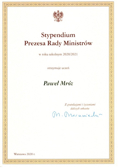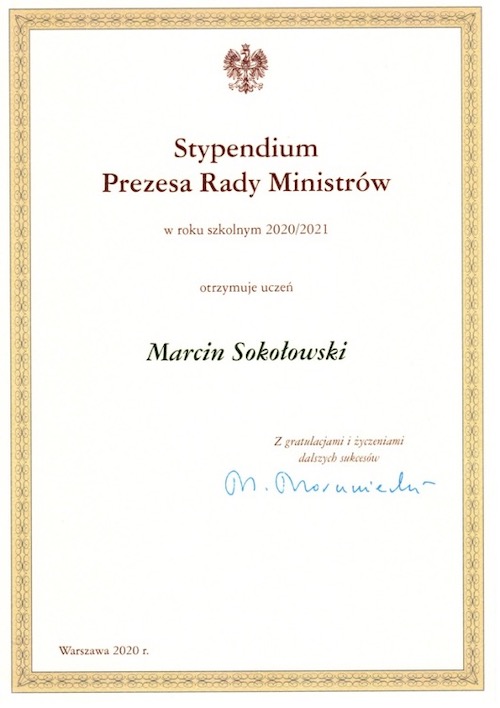 Z wielką radością informujemy, że dwóch naszych uczniów: Marcin Sokołowski /3e/ oraz Paweł Mróz /2c/ otrzymali Stypendium Prezesa Rady Ministrów. Stypendium jest przyznawane uczniowi, który otrzymał promocję z wyróżnieniem, uzyskując przy tym najwyższą w danej szkole średnią ocen lub wykazuje szczególne uzdolnienia w co najmniej jednej dziedzinie wiedzy, uzyskując w niej najwyższe wyniki, a w pozostałych dziedzinach wiedzy wyniki co najmniej dobre.