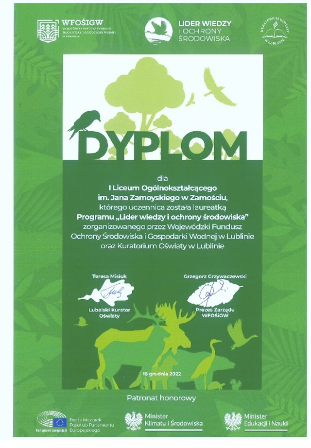 Gabrysia Byra /3G/ otrzymała tytuł laureatki oraz stypendium w ramach programu „Lider Wiedzy i Ochrony Środowiska” realizowanego przez WFOŚiGW w Lublinie we współpracy z Kuratorium Oświaty. Honorowy patronat nad programem objęli Poseł do Parlamentu Europejskiego Beata Mazurek, Minister Klimatu i Środowiska Anna Moskwa oraz Minister Edukacji i Nauki Przemysław Czarnek. Uroczysta gala podsumowująca tegoroczną edycję programu odbyła się 16 grudnia w Tomaszowie Lubelskim.