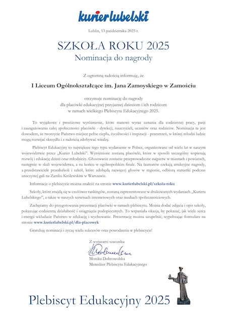 I Liceum Ogólnokształcące im. Jana Zamoyskiego w Zamościu otrzymało nominację do nagrody Szkoła Roku 2025 w ramach Plebiscytu Edukacyjnego „Kuriera Lubelskiego”.