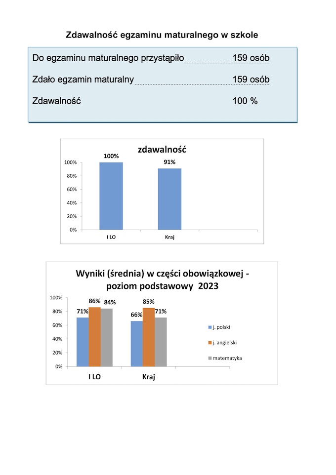 Pierwsi absolwenci czteroletniego liceum przystąpili w 2023 roku do egzaminu maturalnego. Przyszło się im zmierzyć nowymi zasadami egzaminu i poradzili sobie rewelacyjnie. Z dumą informujemy, że wszyscy uczniowie - 159 tegorocznych maturzystów otrzymało certyfikaty maturalne z bardzo dobrymi wynikami – znacznie powyżej średniej krajowej. Uczniom i nauczycielom należą się wielkie podziękowania za mobilizację, zaangażowanie i rzetelną pracę, a rodzicom tegorocznych maturzystów gratulacje!