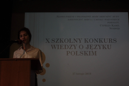 Język polski nie ma tajemnic przed uczestnikami drugiego etapu X Szkolnego Konkursu Wiedzy o Języku Polskim. 27 lutego w auli ośmioro uczniów naszej szkoły, którzy otrzymali największą ilość punktów w części pisemnej, zaprezentowało się podczas ustnej części Konkursu. Mieli za zadanie omówić wybrany problem dotyczący poprawności językowej. Trzeba przyznać, że słuchacze dostali solidną porcję wiedzy zarówno o najczęściej popełnianych błędach językowych, jak i o kulturze języka i jej znaczeniu na co dzień.