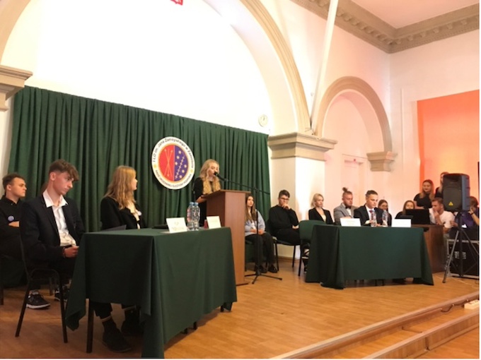Kandydaci, dyrekcja oraz publiczność składająca się z przedstawicieli klas została przywitana przez sekcję parlamentarną SU: Julię Niańko, Natalię Bełkot z klasy 4e, Natalię Cisło z klasy 4f oraz Hannę Grosman z klasy 2i. Debata odbyła się z udziałem publiczności oraz była transmitowana online na platformie Microsoft365 poprzez aplikacje TEAMS.