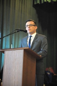 Następnie cała społeczność zgromadziła się w auli szkolnej. Swoją obecnością zaszczycili nas: Pan Prezydent Andrzej Wnuk, Pani Dyrektor Wydziału Oświaty Agnieszka Kowal oraz Rzecznik Prezydenta Pan Marek Gajewski. Zebranych przywitał przewodniczący Samorządu Uczniowskiego Wiktor Banach.