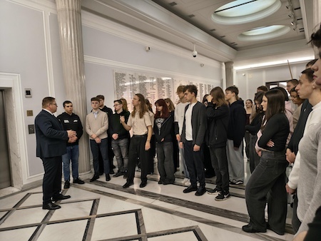 W trakcie wizyty uczniowie mieli możliwość uczestniczenia w otwarciu 46. posiedzenia Sejmu, podczas którego obradowano m.in. nad projektem budżetu państwa na 2026 rok. Zwiedzili także hol główny, gdzie znajdują się tablice upamiętniające parlamentarzystów poległych w czasie II wojny światowej oraz ofiary katastrofy smoleńskiej.