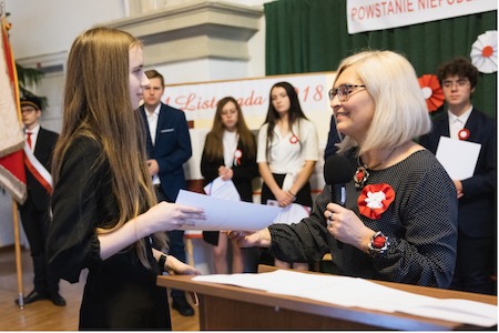 Nasi najzdolniejsi uczniowie mieli szczególny powód do radosnego świętowania Dnia Odzyskania Niepodległości, ponieważ podczas uroczystej akademii, otrzymali od pani Dyrektor dyplomy poświadczające przyznanie Stypendiów im. Bolesława Hassa.