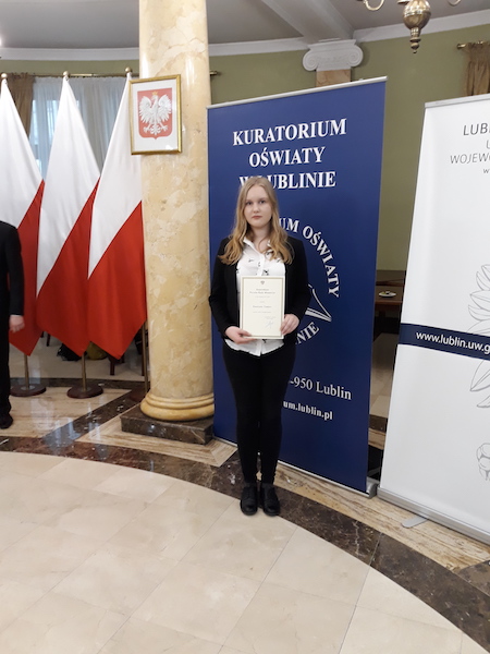 Dyplomy potwierdzające przyznanie stypendium uczniowie odebrali z rąk wojewody lubelskiego Przemysława Czarnka i lubelskiego kuratora oświaty Teresy Misiuk. Uroczystość odbyła się 7 listopada w Sali Błękitnej Lubelskiego Urzędu Wojewódzkiego w Lublinie. Warto dodać, że Kasia otrzymała również Stypendium im. B. Hassa oraz stypendium naukowe.