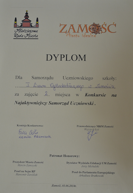 Na sesji Młodzieżowej Rady Miasta, która miała miejsce 3 czerwca 2014 r. w Sali Consulatus w Ratuszu rozstrzygnięty został Konkurs na Najaktywniejszy Samorząd Uczniowski w Zamościu. Zdobyliśmy drugie miejsce!