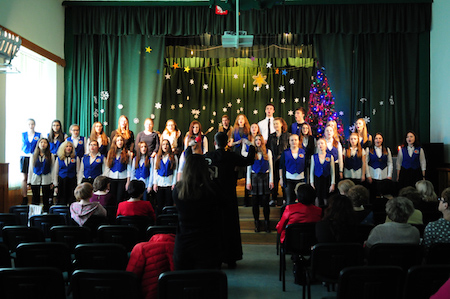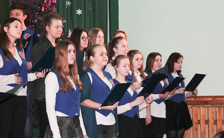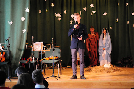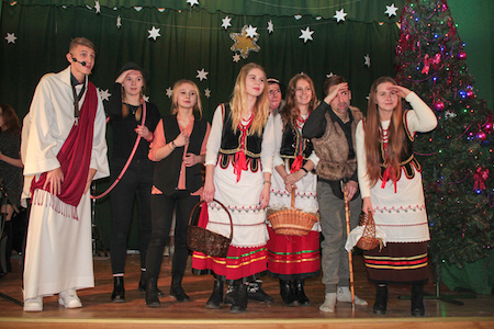 Część artystyczną uroczystości zapoczątkował szkolny chór pod kierownictwem ks. Jerzego Frankiewicza. Wykonał on zarówno piosenki napisane przez księdza, jak i znaną wszystkim kolędę Przybieżeli do Betlejem – trzeba przyznać w dość nietypowej aranżacji. Następnie rozpoczęło się przedstawienie opowiadające o narodzinach Zbawiciela. W postaci wcielili się uczniowie klas pierwszych, którzy pracowali pod kierunkiem pani Bożeny Kukułowicz. Po jasełkach ksiądz Leszek Boryło odczytał fragment Ewangelii opowiadający o przyjściu na świat Jezusa oraz poprowadził wspólną modlitwę. Potem było dzielenie się opłatkiem i życzenia.