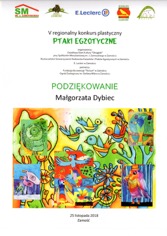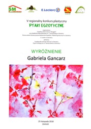 Gabrysia Gancarz /1g/ odniosła kolejny sukces artystyczny. Jej praca uzyskała wyróżnienie w V regionalnym konkursie plastycznym „Ptaki egzotyczne”.