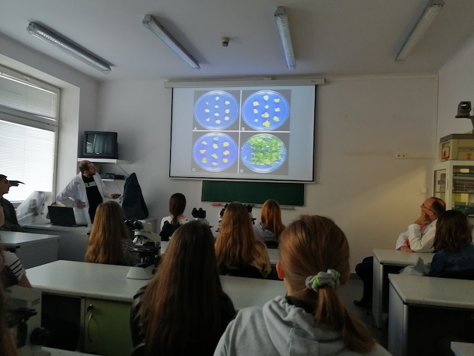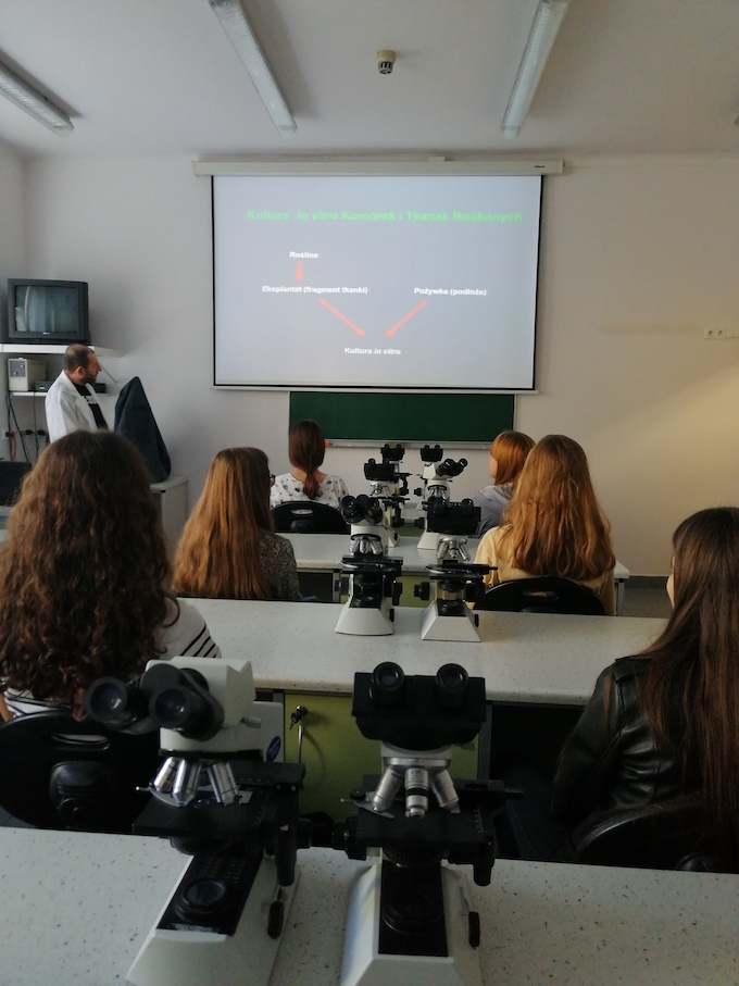 Podczas pierwszego wyjazdu na uczelnię uczniowie wzięli udział w wykładzie dotyczącym zasad i warunków prowadzenia kultur in vitro oraz zapoznali się z wyposażeniem i zasadami pracy w Katedrze Biologii Komórki. Najciekawszym doświadczeniem okazała się praca pod kierunkiem pracowników naukowych. Uczniowie pracowali w sterylnych komorach z laminarnym przepływem powietrza, w których dokonali sterylizacji nasion i założyli własne hodowle roślin in vitro.