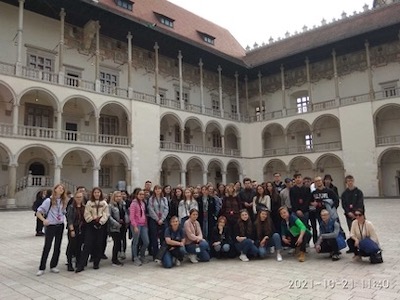 W dniach 21-23 października 2021 roku, uczniowie klasy 3CG oraz 3EG, wraz z wychowawcami i opiekunami, wybrali się na wycieczkę, połączoną z Pielgrzymką Maturzystów na Jasną Górę. Pierwszy dzień zarezerwowany był na zwiedzanie najważniejszych zabytków Krakowa, m.in. Zamku Królewskiego na Wawelu, Smoczej Jamy, Katedry Wawelskiej i Dzwonu Zygmunta. Nie mogło zabraknąć także spaceru po pięknym krakowskim Rynku oraz zwiedzania Bazyliki Mariackiej, przy której wszyscy mogli usłyszeć słynny hejnał, odegrany z wieży przez trębacza. W drugim dni uczniowie wyruszyli na górskie szlaki. Po lekkiej modyfikacji planu i kilku godzinach wspinaczki, udało się zdobyć szczyt Sarniej Skały (znajdujący się na wysokości 1377 m). Po zejściu ze szlaku oraz wizycie na Krupówkach, klasy udały się na nocleg do Kęt, w okolicach Oświęcimia. Trzeci dzień był czasem na wyciszenie i refleksje, ponieważ zwiedzaliśmy Muzeum Auschwitz-Birkenau w Oświęcimiu i Brzezince, które stało się dla świata symbolem terroru, ludobójstwa i Holokaustu, dokonanego przez niemieckiego okupanta. Uczniowie w ciszy i skupieniu, wsłuchując się w słowa przewodnika, przeszli przez miejsce zbrodni, ludzkiego okrucieństwa i bezduszności.