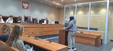 10 kwietnia klasa 2e uczestniczyła w obserwacji rozprawy cywilnej w Sądzie Okręgowym w Zamościu. Przewodniczący sędzia przybliżył uczniom zasady prowadzenia postępowania, sposób przesłuchiwania świadków oraz wskazał różnice między postępowaniem cywilnym a karnym, ilustrując je konkretnymi przykładami.