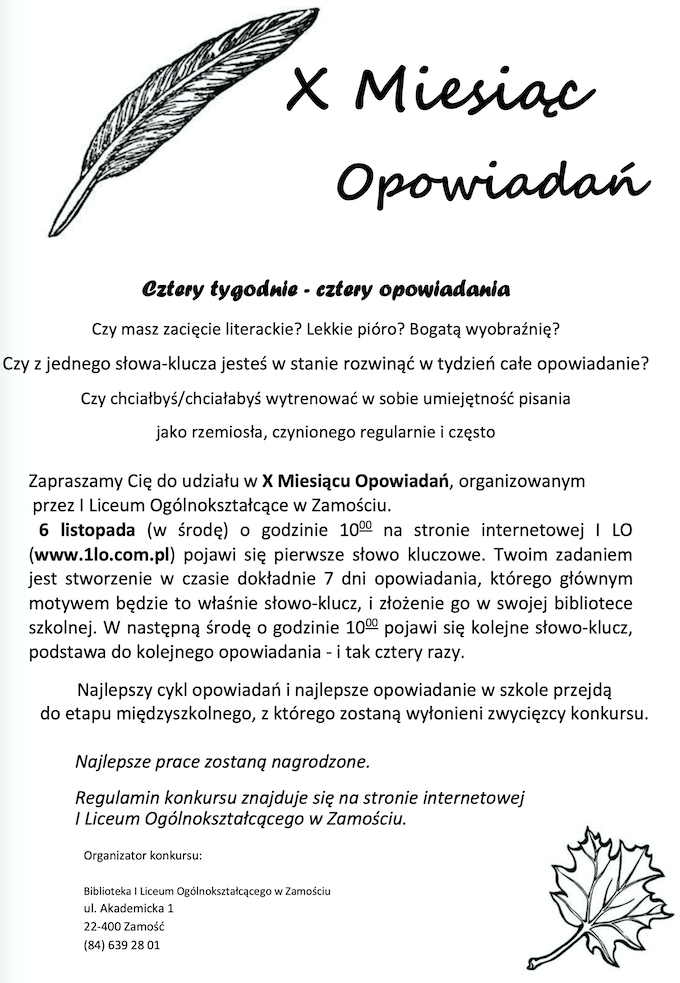 Zapraszamy do udziału w dziesiątej edycji konkursu literackiego. Od 6 listopada na naszej stronie internetowej publikowane będą słowa kluczowe. Konkurs polega na napisaniu czterech opowiadań „na zadany temat” w ciągu 4 tygodni. Szczegóły w zakładce: Konkursy. Bliższych informacji udziela biblioteka.