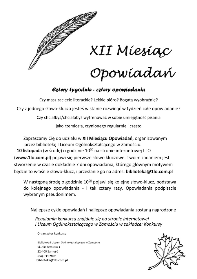 Jak co roku jesienią zapraszamy do udziału w międzyszkolnym konkursie Miesiąc Opowiadań. Jeśli macie talent literacki i trochę samodyscypliny zmierzcie się z zadaniem napisania czterech opowiadań w ciągu kolejnych czterech tygodni. Startujemy już 10 listopada. Na najlepszych autorów czekają nagrody!