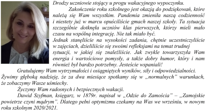 26 czerwca obchodzimy zakończenie bieżącego roku szkolnego, inne niż do tej pory, ale równie ważne i wyjątkowe. Niestety, zabraknie wspólnego celebrowania tych uroczystości przez całą naszą społeczność. Kończymy jednak ten rok z nadzieją, że od września wrócimy fizycznie do szkoły. Chyba wszyscy tęsknimy już za edukacyjną normalnością-przysłowiową szkolną ławką, kolegami, koleżankami, bezpośrednim kontaktem z nauczycielami, zwykłą rozmową czy wymianą myśli.
