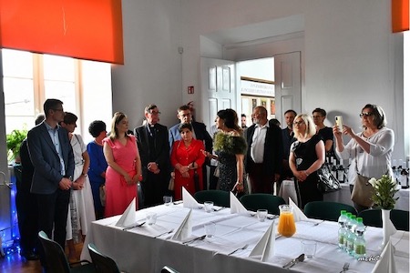 W tym roku w Zamojskiej Alei Sław upamiętniono Różę i Jana Zamoyskich, z tej okazji do naszego miasta przybyło wielu przedstawicieli rodu, którzy po uroczystościach oficjalnych spotkali się w sali kolumnowej pałacu Zamoyskich, gdzie powitała ich pani dyrektor naszego Liceum dr Bożena Krupa.