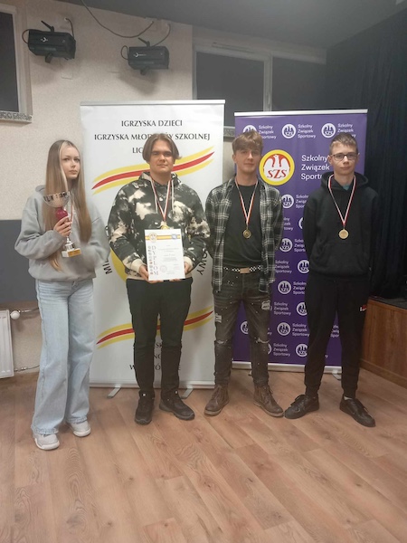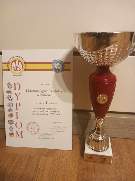 W dniu 1 grudnia 2023 r. w Zamościu odbyła się Miejska Licealiada w Szachach Drużynowych. Turniej odbył się w III LO. Do rozgrywek przystąpiło 8 zamojskich szkół ponadpodstawowych. Każdą drużynę reprezentowało 4 zawodników. Naszą szkołę reprezentowali: Zuzanna Tychlowiec (kl. 2H), Karol Prochowicz (kl. 2B), Mikołaj Chudy (kl. 4A) i Wiktor Kiełbiński (kl. 4A) pod opieką p. Magdaleny Nizioł.