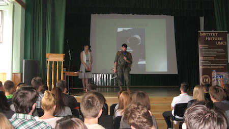 Dr Krzysztof Latawiec poprowadził wykład na temat społeczności rosyjskiej zamieszkującej tereny Zamojszczyzny przed I wojną światową. Mówił m.in. o rusyfikacji na ziemi zamojskiej zapoczątkowanej w latach 60 XX wieku, funkcjonowaniu Klubu Ruskiego, a także stosunkach między różnymi narodowościami mieszkającymi w Zamościu. Grzegorz Antoszek – student UMCS – opowiedział nam, czym zajmuje się Studenckie Koło Naukowe Rekonstrukcji Historycznej, wraz z koleżankami zaprezentował mundur żołnierza ROA (Rosyjskiej Armii Wyzwoleńczej) i sukienki, które kobiety nosiły na początku XX wieku. Na koniec dr Janusz Kłapeć przedstawił bogatą ofertę edukacyjną Instytutu Historii UMCS i zachęcał do studiowania nauk historycznych.